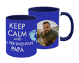 Per chi ama essere sempre originale, non poteva mancare che festeggiare la ricorrenza del papà, con questa tazza con foto da decorare con il motivo grafico dallo sfondo blu, con la scritta bianca con il Keep Calm e piccole impronte associate al ciuccio.
