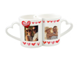 Le tue tazze accolgono la tua foto romantica, la quale verrà riprodotta sulle due metà, in abbinamento a questa grafica stilizzata da cuori rosso.