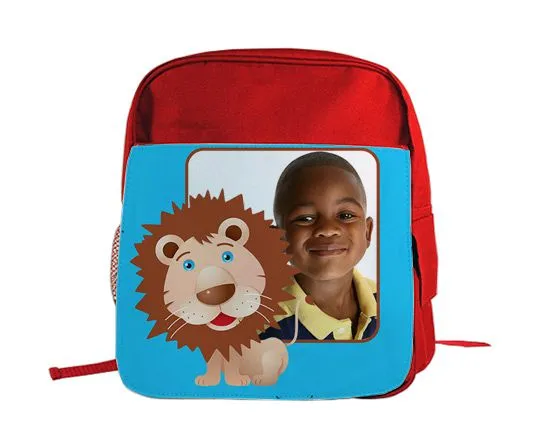 Scegli questo zaino per la scuola e personalizza la sua tasca con la stampa della tua foto, associata a questa grafica con il tenero leoncino e la cornice nel colore azzurro; farà da ornamento alla stampa della tua foto o della tua immagine, che posizionerai all’interno dello spazio a disposizione.